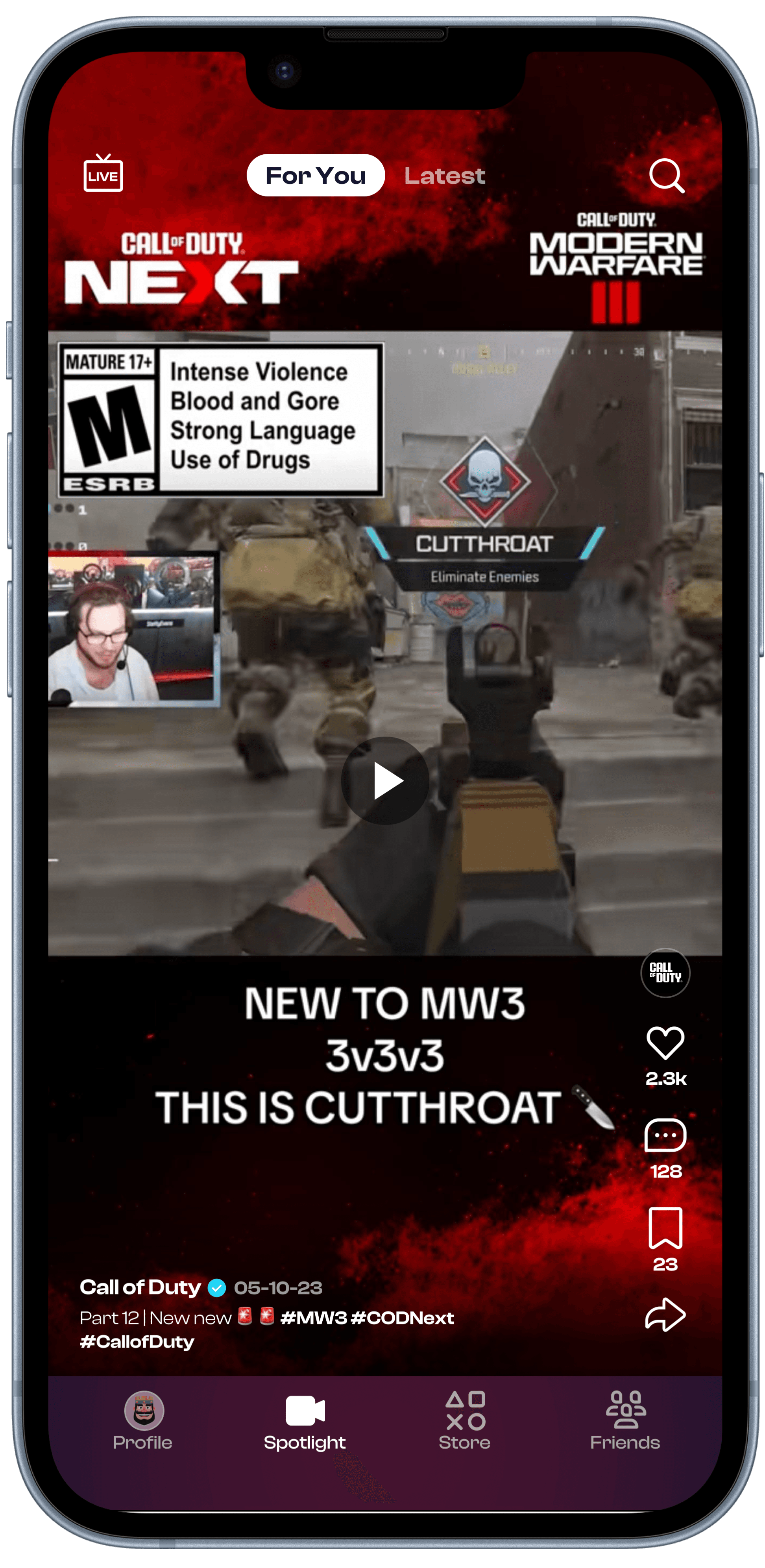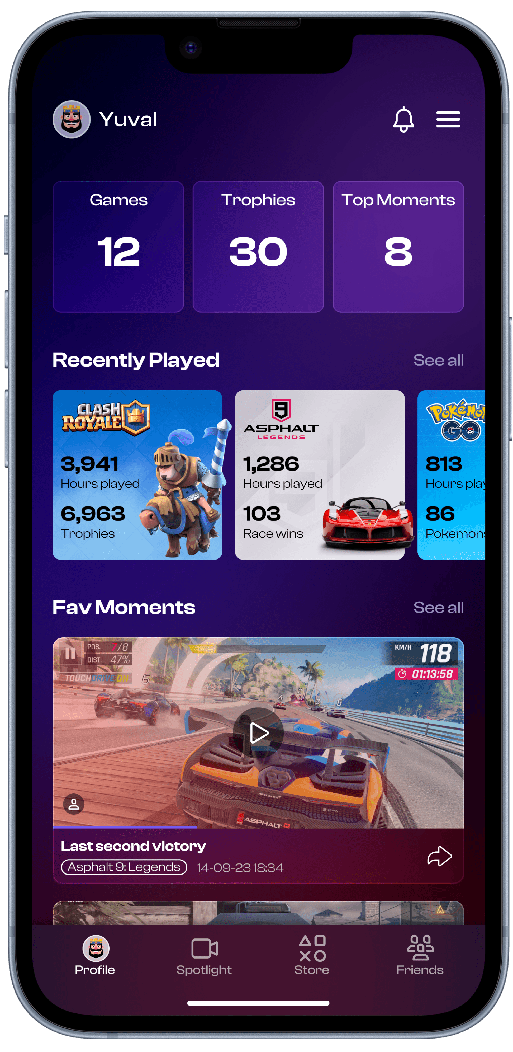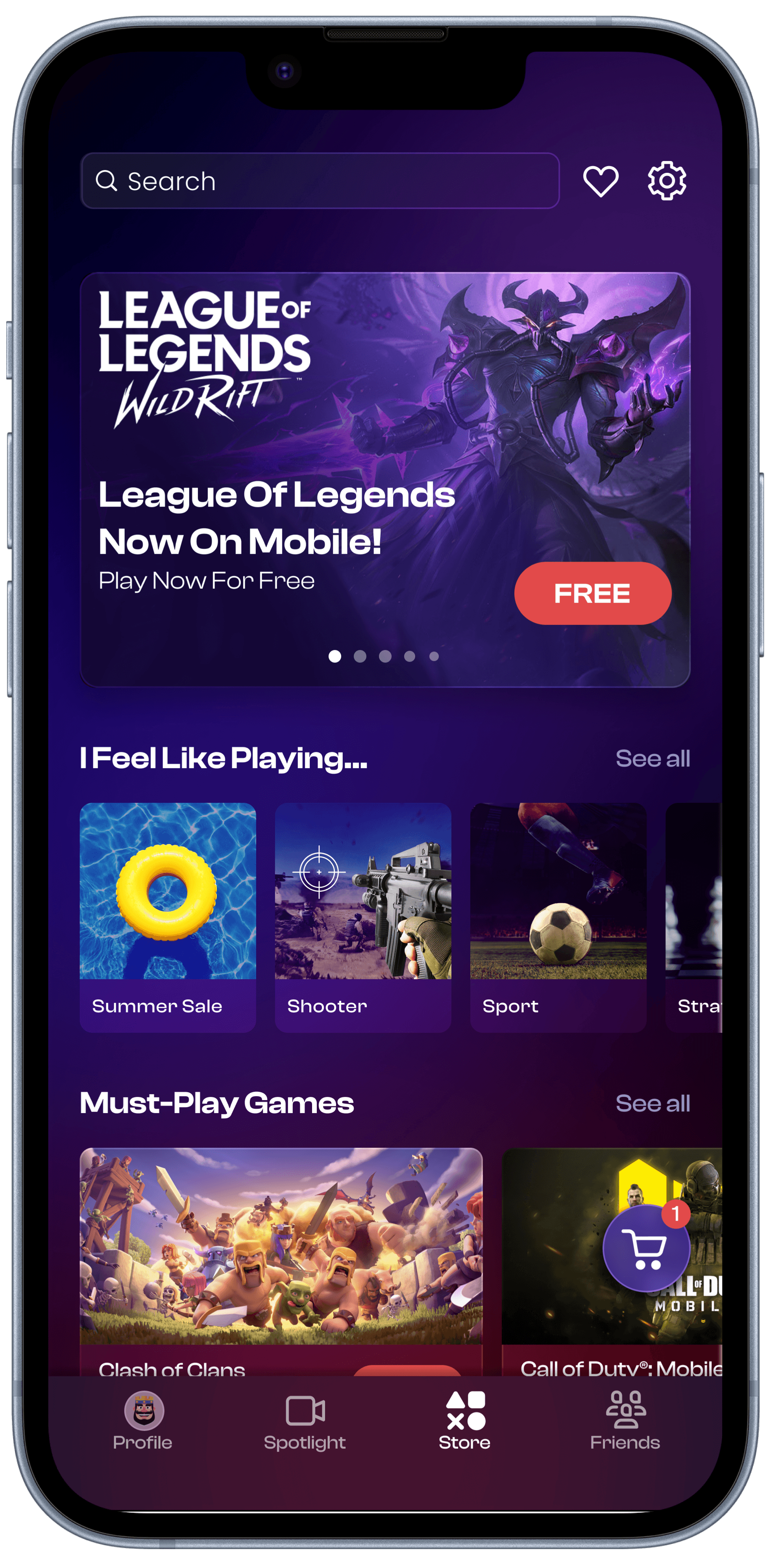 Inspired by TikTok-style content consumption, the Spotlight feed surfaces short-form gaming clips and highlights. It drives discovery through engagement, letting users stumble upon new games organically through community content rather than traditional advertising.